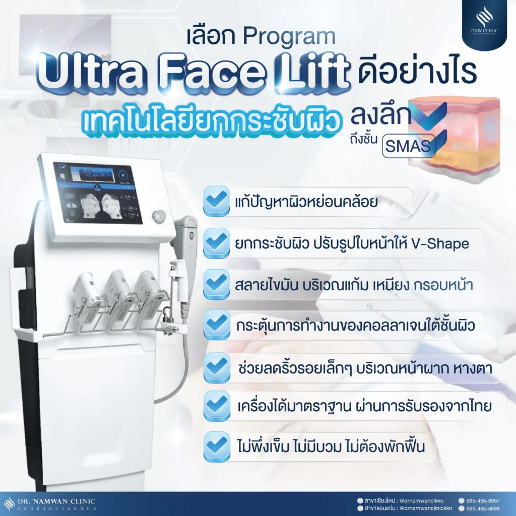 A3: Program Ultra Face Lift เหมาะสำหรับผู้ที่มีปัญหาผิวหย่อนคล้อย ริ้วรอย และต้องการยกกระชับผิวหน้าโดยไม่ต้องผ่าตัด
